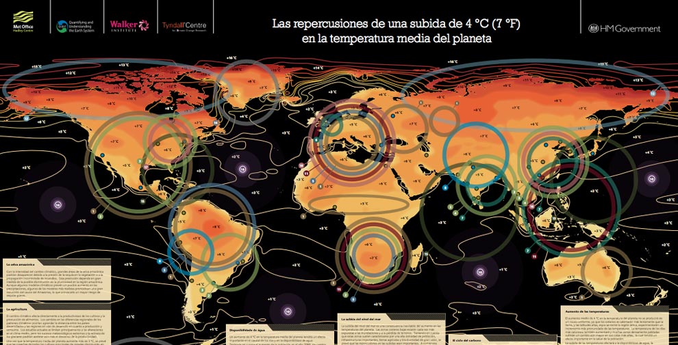 Aunque es del 2010, esta enorme infografía presenta los diversos escenarios de aumento en la temperatura en un mapa, y sus impactos en sectores como la agricultura, la disponibilidad de agua y el aumento del nivel del mar. Además, divide por áreas geográficas la intensidad de los efectos del cambio climático.